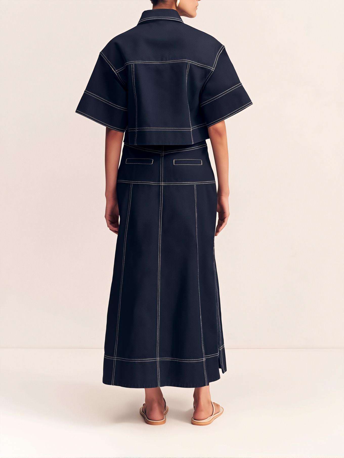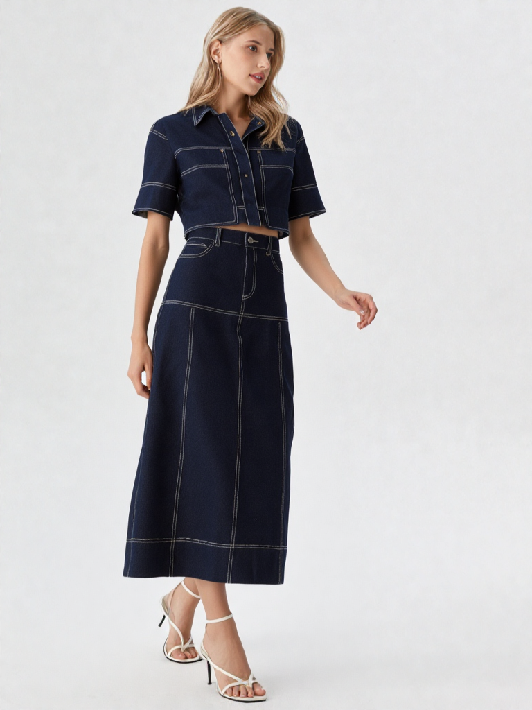 A versatile two-piece featuring a high-waist slit skirt and cropped top with bold contrast stitching—wear together or mix for effortless edge.